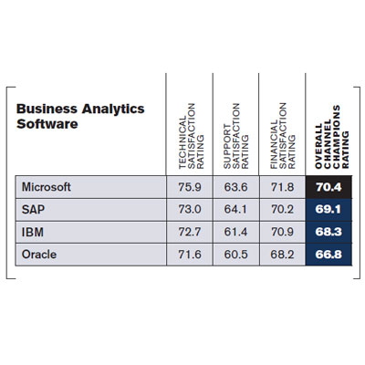 Microsoft was this year's winner in the Business Analytics Software category, taking the top spot over competitors SAP, IBM and Oracle, just as it did last year and in 2011. Microsoft's standing may have received a boost from new releases of the company's PowerPivot, Power View and other business intelligence tools built into the new SQL Server 2012 database engine.