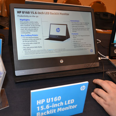 HP has an interesting proposition for road warriors craving a multimonitor setup. This USB-powered portable 15.6-inch monitor has an iPad-like leather case that allows the monitor to be propped up at various angles. The screen has a standard-issue 1,366 x 768 resolution but counteracts that dull spec with a ("dull" in a good way) matte screen. The U160 will be available later this month for $179.