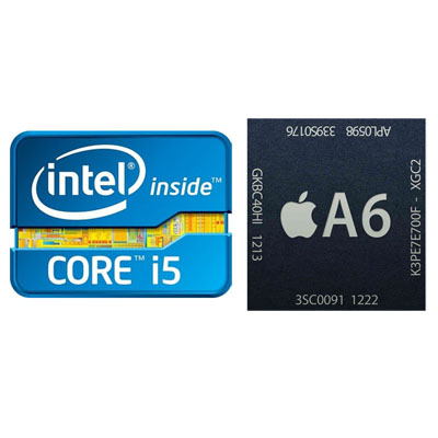 Apple's dual-core A6X ARM-based SoC runs at 1.4GHz with 1 GB. The new chip includes four PowerVP SGX 554MP4 GPUs clocked at 300MHz plus twice the video memory. While Apple's new part might be faster than its old one, Intel's Core i5 still cleans its clock. In the absence of review units, we took to the Web and found Intel running rings around Apple. We even found one using Geekbench, which put i5's floating point performance and overall score at more than four times that of A6X, which would put it among the Test Center's top 10 fastest laptops.