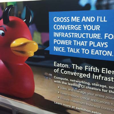 Rubber ducks are usually benign, sweet creatures -- but not this one. At Eaton's show floor space, this horned rubber duck was threatening to converge people's infrastructures -- which was a bit strange since combining servers, storage and networking in IT is supposed to be a good thing, right?