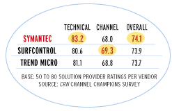 While solution providers rallied around Symantec products, they showed less enthusiasm for the vendor’s channel programs, giving it lower marks than both of its rivals in sales margins, upselling opportunities and visibility in the channel. This put the company in third place, albeit by a slim margin, on channel criteria overall. In its biggest setback, Symantec fell behind SurfControl, the overall runner-up and leader in channel-program areas, by 3.9 points in the critically important area of sales margins.
