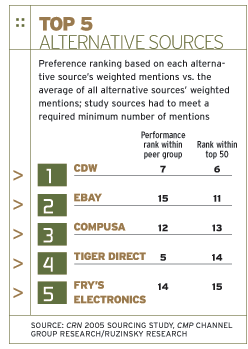 While familiar sources CDW, Vernon Hills, Ill., and eBay, San Jose, Calif., claimed the top two spots as preferred alternative sources, newcomer to the list Newegg.com made an impressive showing when it came to performance. Among the alternative sources, Newegg.com finished first for products (which includes breadth and availability), price, information systems, logistics, configuration and integration, problem avoidance and resolution, effectiveness and loyalty. Insight Enterprises, Tempe, Ariz., was cited for human factors, such as technical knowledge and expertise of sales representatives, while PC Connection, Merrimack, N.H., was tops in credit.