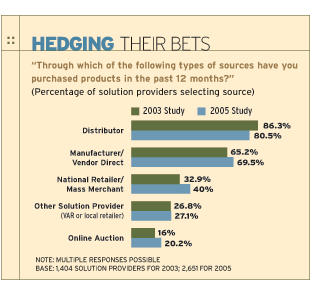 Meanwhile, 69.5 percent bought products directly from manufacturers, up from 65.2 percent in 2003. Sales through national retailers showed the largest increase, at 40 percent from 32.9 percent two years ago. Solution providers also bought from other VARs and systems integrators (27.1 percent compared with 26.8 percent in 2003), direct marketers (27 percent compared with 25.9 percent) and through online auctions (20.2 percent compared with 16 percent).
