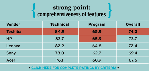 The Irvine, Calif.-based vendor finished first or tied for first on seven of the eight technical criteria. Partners particularly liked the features of Toshiba's Tecra and Satellite notebooks, giving the company a 2.8-point