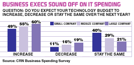 What's more, 19 percent of large-company executives said they expect their IT budget to decrease over the next year, compared with 11 percent of small-company executives and 16 percent of midsize-company executives, according to recent CRN Business Spending Surveys. On the plus side, 89 percent of small-company executives and 84 percent of midsize-company executives polled said they expect their technology budgets to increase or stay the same, compared with 81 percent of large-company executives.