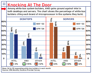 In the server market alone, AMD is aiming to double the number of its system builders this year to 1,000, up from 500. Exclusive CRN research shows the AMD push is gaining traction (see chart). Over the past year, the percentage of custom-system builders using AMD processors in the servers they build nearly doubled to 29 percent in April 2004, up from 15 percent in May 2003. The percentage of custom-system builders using Santa Clara, Calif.-based Intel's processors in their servers during this same period dropped 8 percentage points to 69 percent. AMD has made similar gains in the custom-system-builder desktop market.