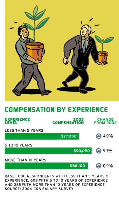 The trends in salary increases had a major impact on pay levels among the groups. For the first time since CRN has been conducting the survey, the $90,050 average salary earned by those in the middle group surpassed the salary level of the veterans, who earned $86,100 in 2003.