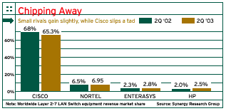 Research shows that these vendors' efforts are yielding some slight gains against the networking behemoth. For example, Enterasys, Hewlett-Packard and Nortel posted growth,albeit each less than 1 percent,in LAN switching market share during the second-quarter 2003 compared with the same quarter a year ago, according to Synergy Research Group. During the same period, Cisco's market share dropped nearly 3 percent.