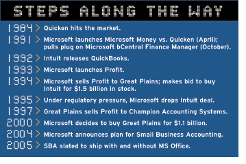 Microsoft has had its eye on Intuit and its Quicken-QuickBooks franchise for more than 20 years. Quicken debuted in 1984 and has been wildly successful in the home-office accounting market. QuickBooks, for small businesses, followed in 1992. The next year, Microsoft responded with Microsoft Profit, which was actually developed by then-independent Great Plains Software, Fargo, N.D. Profit fared poorly, and Microsoft sold it to Great Plains in 1984. (Note for trivia buffs: Great Plains then sold Profit to Champion Accounting Systems in 1997, and the trail goes cold from there.) Microsoft’s bCentral hosted small-business accounting offering did little better and was discontinued.
