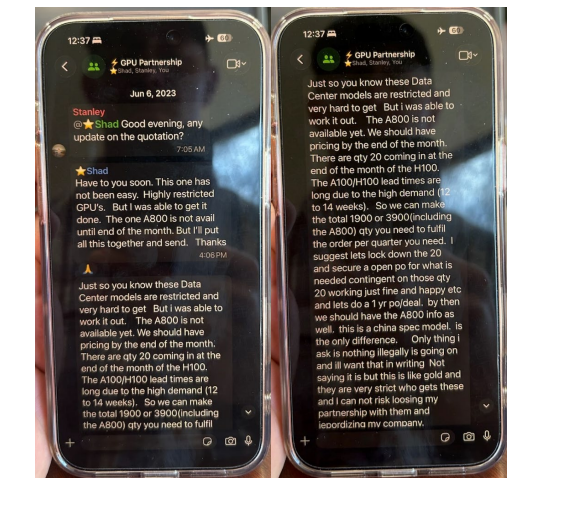 English at one point in the message string noted that the GPUs are highly restricted and hard to get, and wrote, “Only thing I ask is nothing illegally is going on and ill want that in writing.” (sic)