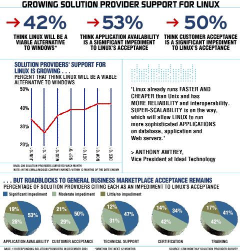 But solution providers also see roadblocks in Linux's path. According to 53 percent of the 179 solution providers surveyed, application availability is a "significant impediment" to acceptance. Almost half of those surveyed ticked off technical support and overcoming corporate inertia as major problems to be overcome before customers accept the open-source operating system as an alternative to Windows.