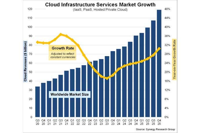 For the fourth quarter of 2025, cloud infrastructure service revenue reached $119 billion, up 30 percent year over year. These services include IaaS, PaaS and hosted private cloud services.