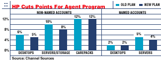 The biggest impact will be felt in non-named accounts, in which HP partners will receive 5 points for desktops and 8 points for servers and storage products, channel sources said. Previously, they received 6 and 10 points, respectively, for products bought directly from HP through a solution provider's referral. The 12 points partners receive for CarePacks will not change.