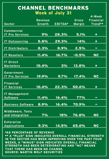 CRN compared financial measures from the week of July 31 with those from the week of July 3 to develop the most recent data on four-week trends. The data show that during this period, commerical professional IT services and IT outsourcing were the two categories that saw the biggest gains in overall financial strength. Joining them on the upside were two other categories, direct marketers and financial IT services.