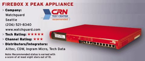 WatchGuard is 100 percent channel-focused. Its partner program requires resellers to meet sales quotas and certification criteria, purchase an internal use unit and actively market WatchGuard products. Dedicated technical support is offered to all partners, and the company guarantees a three-hour response time. Marketing and sales support, MDF, recurring product rebates, a dedicated partner Web site and e-mail newsletter also are provided. The FireBox X Peak costs just under $10,000, and average reseller margin is 20 percent.