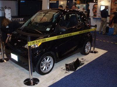All it takes is five seconds for someone to steal your data. Or at least that's what McAfee was illustrating with this Smart Car. The driver's side window was smashed out and the laptop, left next to the vehicle on a pile of shards, was easily removed. Better lock that data down.