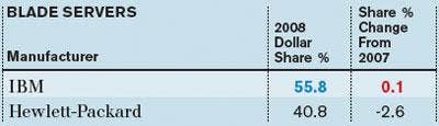 IBM and HP continue to dominate the server arena, accounting for more than 96 percent of the market. IBM widened its lead slightly in 2008.
