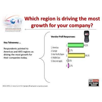 With much of Europe in financial crisis, it's perhaps no surprise that most vendor executives picked Asia Pacific/Japan (49.3 percent) and the Americas (45.3 percent) as the region responsible for driving the most growth for their respective companies.