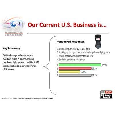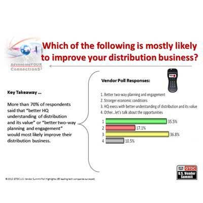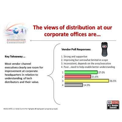 At the Global Technology Distribution Council's annual Vendor Summit last month, vendors took a real-time survey during one of the sessions to get their take on distribution relationships, the challenge of spreading the channel gospel within their own organization and where they see the business going. In all, more than 200 attendees from 65 vendors were on hand. Here's a look at the results.