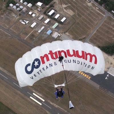 Continuum launched the Continuum Veterans Foundation, a nonprofit group that provides financial support to other nonprofit organizations focused on helping find jobs for veterans. A portion of Continuum's Service Desk revenue helps fund the program, according to the company. Pictured here, Continuum CEO Michael George parachuted out of a plane in 2012 to launch the program.