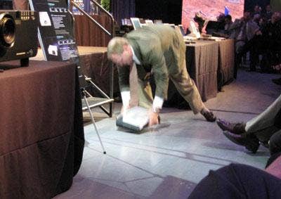 The closed Toughbook 31 landed with a loud pop on the floor below the podium and stage platform. Panasonic representatives moved to over to inspect for damages.