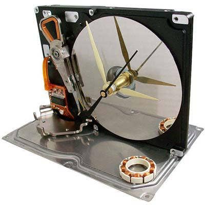 PC enthusiasts will flip for this clock made from repurposed computer parts -- specifically a 3.5-inch hard drive -- by Teaco Art, Lakewood Ranch, Fla. The dial is a mirror-finished disk platter, with brass hour and minute hands and a coordinated black second hand. The base of the clock is made from the hard drive's protective case, accented by copper motor winding. It is priced at $39.
