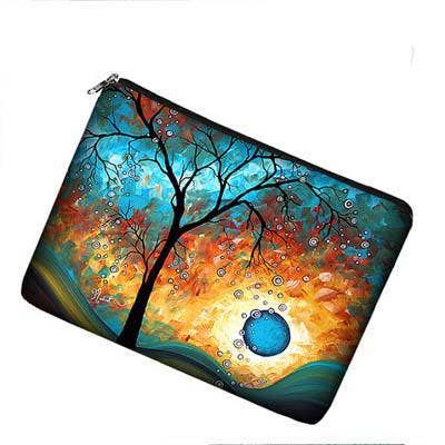Bright and colorful, this screen printed sleeve is sized to fit most 13-inch laptops and features the "Aqua Burn" design from MadArt. It is made from black twill upholstery-weight fabric treated to repel moisture and dirt. Its inner core is built with water-resistant foam padding designed to shield electronics from impact. It is available from Janine King Designs, Utica, N.Y., for $54.99