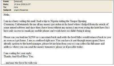 At first glance, it looks like your typical Nigerian 419 scam. The twist is that the e-mail comes from what appears to be a trusted source after a hacker hijacked someone else's account and sent the spam e-mail message to the victim's personal contact list. Friends of the victim were urged to respond quickly via e-mail. The hacker was also sure to include the victim's signature at the bottom, in a seemingly convincing proof of identity.