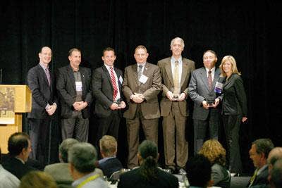Symantec President and CEO Enrique Salem, (left); and GiGi Schumm, Symantec vice president and general manager, Symantec Public Sector, (right) presented the awards to Ron Ross, Senior Computer Scientist, National Institute of Standards and Technology; Erik Hopkins (accepting for Sen. Tom Carper, D-Del.), Michael Dent, CISO for Fairfax County Government, Fairfax, Va.; Doug Jacobson, Professor and Director of Iowa State University Information Assurance Center; Chuck McGann,corporate information security officer, U.S. Postal Services.